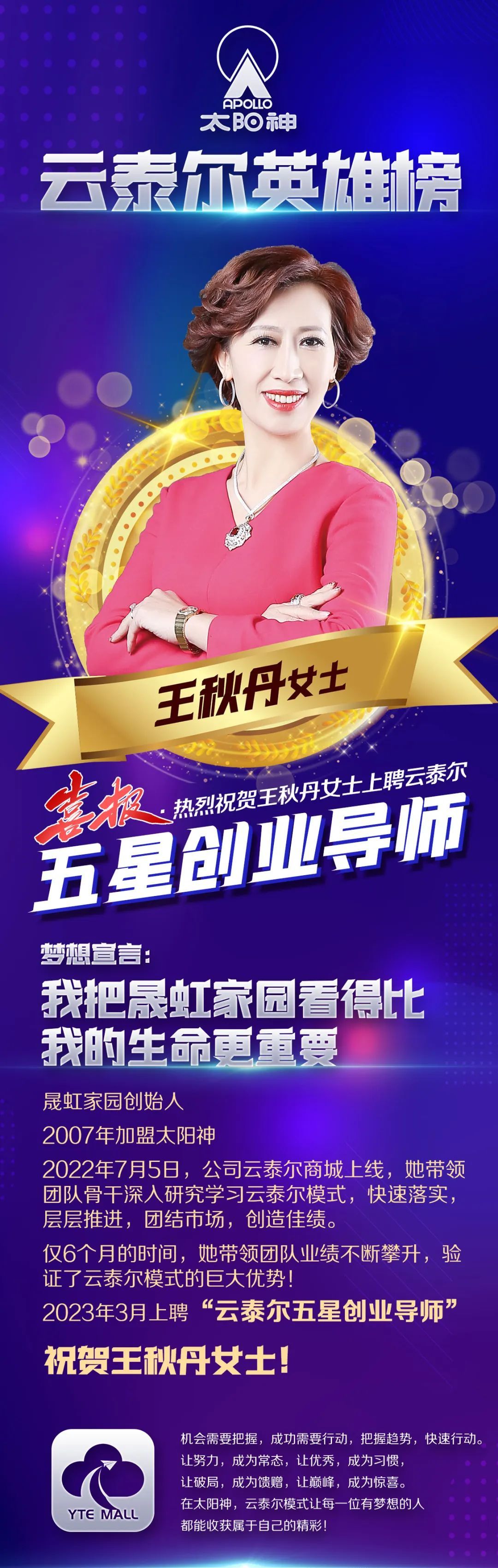 会议典范赞誉本次月度赞誉会令人惊喜的是,在转型晋级云泰尔半年左右的时刻,初次呈现了两位“云泰尔五星创业导师”!这对个人来说,是梦想完成的一个里程碑,对太阳神来说,是形式成功的强有力见证!一起咱们也可以看到,任何的生长,都凝聚了汗水和汗水,都意味着坚决的信仰、很多的行动和勤劳的支付,让咱们向典范学习!