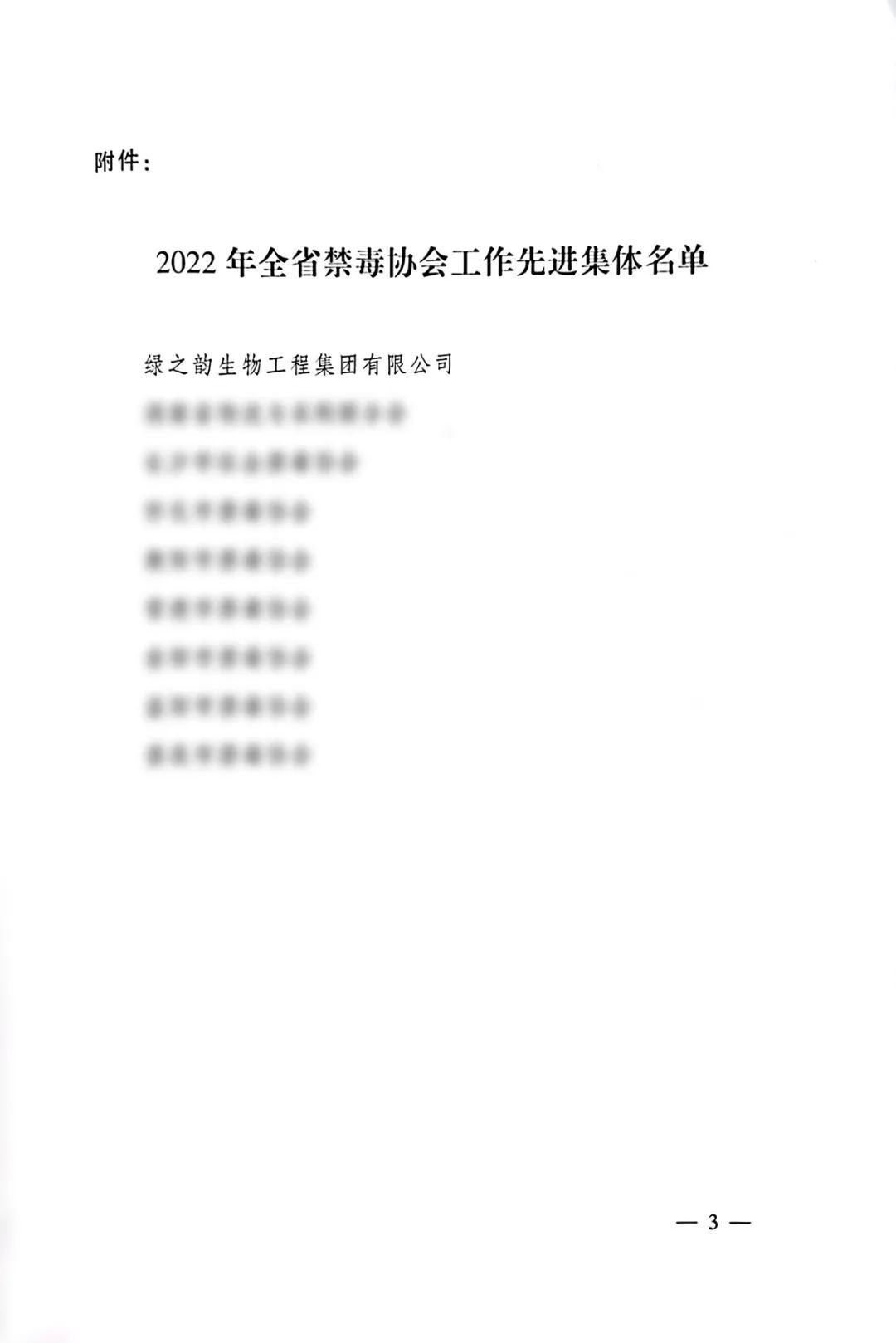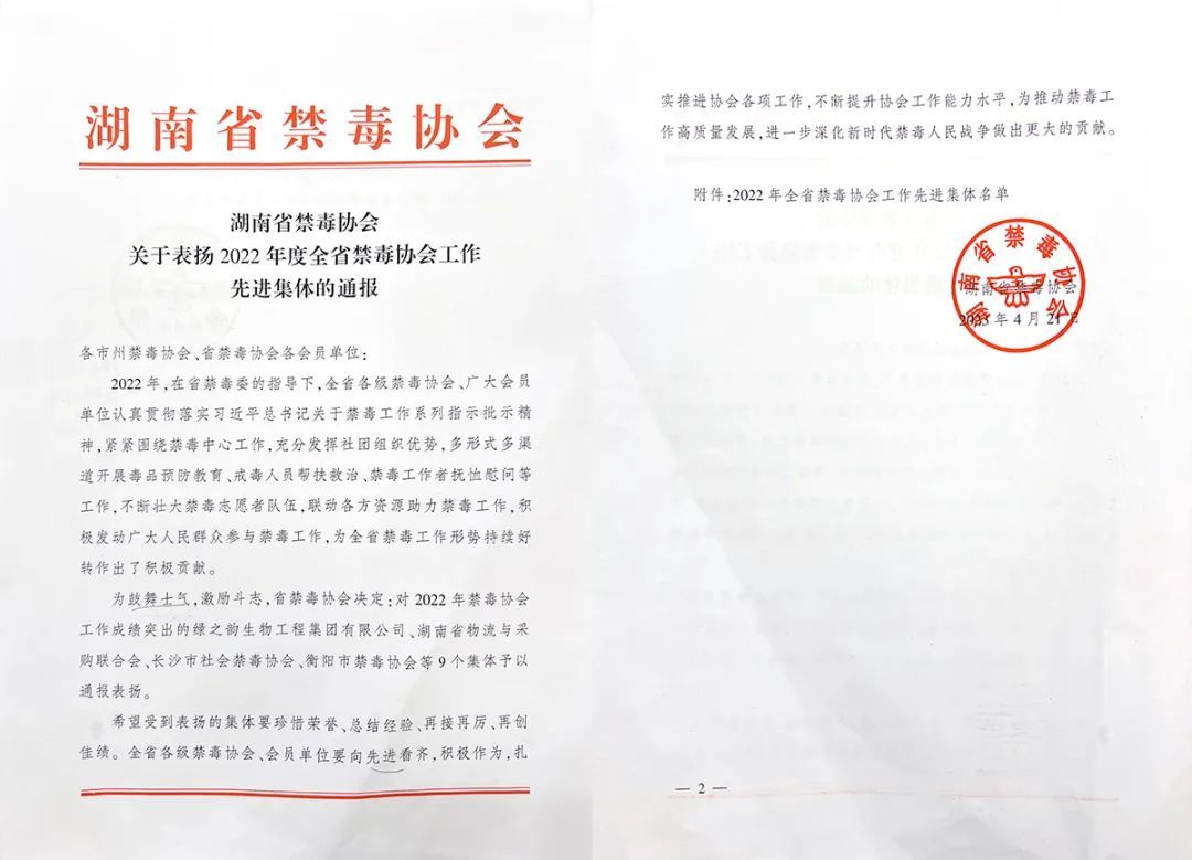 绿之韵集团被评为“2022年度湖南省禁毒协会工作先进团体”