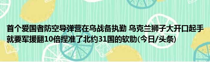 大家好,小编【离人未归】,首个爱国者防空导弹营在乌战备执勤 乌克兰狮子大开口起手就要军援翻10倍捏准了北约31国的软肋很多人还不知道,那么现在让我们一起来看看吧!