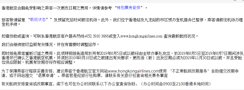 并在官网发布公告称,香港航空会豁免受影响乘客一次更改日期的费用。