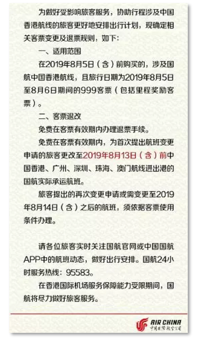 8月5日前购买的,涉及中国香港航线,且旅行日期在8月5日至6日期间的国航航班,可免费在客票有效期内办理退票手续或为首次提出航班变更申请的旅客更改至8月13日(含)前中国香港、广州、深圳、珠海航线进出港的国航实际承运航班。