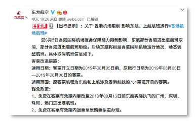 东方航空在其官方微博上宣布取消今日部分上海、昆明、湛江、杭州往返香港的航班,同时发布了退改签政策。
