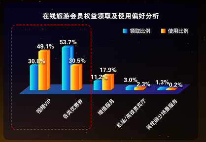 会员权益使用偏好方面,视频VIP、优惠券、增值服务等的领取比例和使用比例较高,尤其是视频VIP的使用比例高于领取比例,是最受欢迎的会员权益。