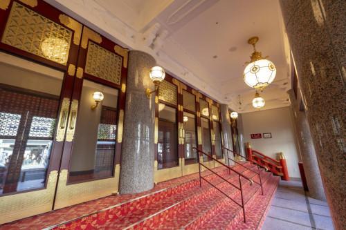 誉为“昭和初期名建筑”的“南座”剧场,首先引人注目的便是正面玄关,装点了金色花纹的灯具和门扉。从格子状的天花板到艺术风格的灯罩、吊灯等细节之处都保留了昭和初期的精美内饰。来到剧场之后,不要仅仅欣赏戏剧,而忽略了“南座”美轮美奂的艺术性。