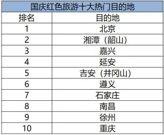 据飞猪最新发布的《2019“十一”黄金周旅游数据报告》显示,今年国庆黄金周,北京位列红色旅游十大热门目的地榜首,湘潭韶山、嘉兴、延安、吉安井冈山、遵义、石家庄、南昌、徐州、重庆位列第二至第十位。从红色景区一日游预订量增幅来看,吉安井冈山、重庆、湘潭韶山增幅最大,分别为147%、67%和46%。