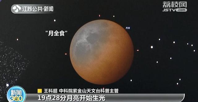 王科超透露:月球完全进入到地球阴影的时间是19点09分,整个“月全食”天象持续的时间只有不到20分钟,19点28分月亮开始生光,到20点53分,整个“月全食”完全结束。