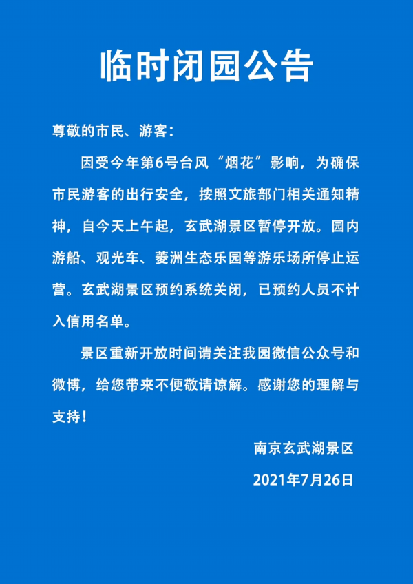 因受台风“烟花”的影响,为确保游客出行安全,接上级文旅部门通知,自2021年7月26日起,钟山风景区所属的中山陵、明孝陵、灵谷景区,音乐台、美龄宫、白马公园等景点,以及明孝陵博物馆、孙中山纪念馆、南京抗日航空烈士纪念馆等文博场馆均暂停开放。紫金山索道、区内电瓶车等设施停运。中山陵预约系统关闭,已预约游客不计入信用名单。各网络销售票按原渠道退回。 景区开放时间另行通知,给您带来的不便敬请谅解。恳请相互告知。