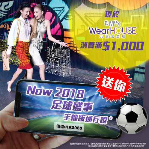 相信不少爸爸都是足球迷,适逢四年一度的足球盛事,只要在E-Max WearHouse消费满$1,000即可获赠价值HK$980的Now 2018足球盛事手机版通行证!既可以为爸爸买到满意的父亲节礼物,又可以跟爸爸一起收看精彩刺激的足球赛事,机会难得,数量有限,先到先得,送完即止,你还不行动?