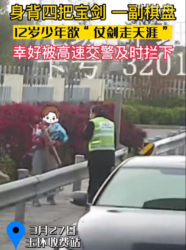 【12岁男生要跟张三丰学太极背剑出走:因学习问题凌晨3点离家步行4小时】据报道:3月27日,浙江台州。高速交警六大队接到报警称收费站入口一行人欲上高速,民警立即赶赴现场。大约10岁左右的孩子肩扛4把宝剑,带着两大包行李,踉踉跄跄地进入收费站最右侧通道后蹲了下来。收费站工作人员小吴发现这一情况后立即上前询问,第一时间将孩子带到安全的地方。随后,民警通过调查联系上了孩子的父母。这个孩子叫小杰(化名),小杰因学习问题被家人说了几句。令家人没料到的是,小杰竟在第二天凌晨3时30分左右,带上了自己心爱的 宝贝 离家出走。从天黑到天亮,十几公里的路程,走了近4个小时,小杰来到了玉环收费站入口。小杰爷爷告诉民警,进入初一后,孙子对学习没有太大兴趣。相反,小杰非常喜欢他的宝剑,十分热爱张三丰太极拳,这也是小杰一定要带上4把宝剑的原因。最终,在和父母沟通后,小杰跟着父母回了家。