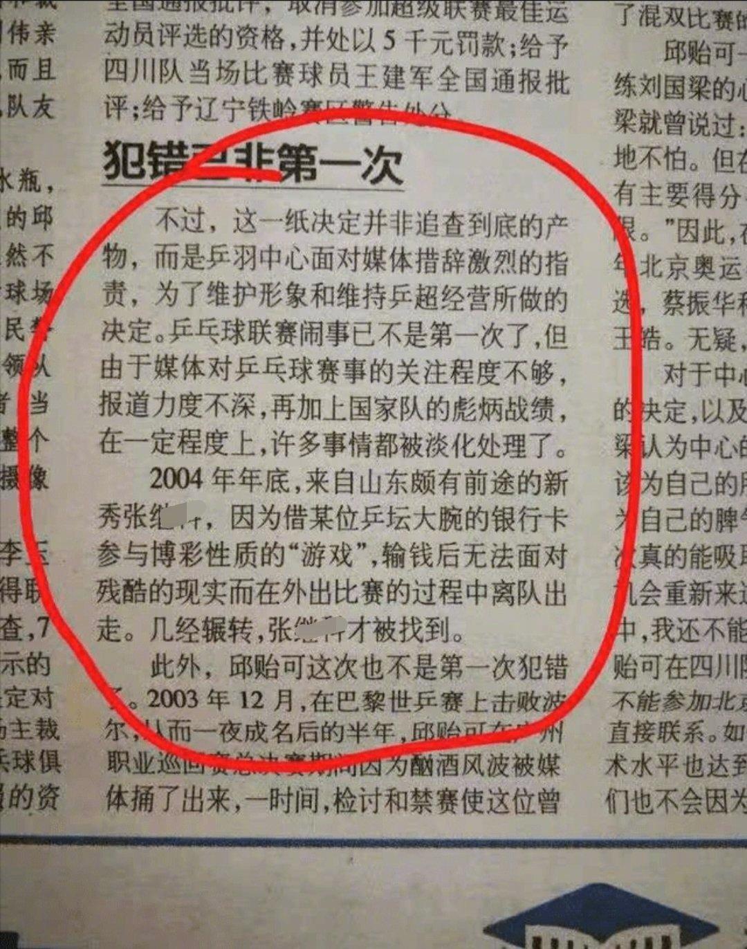 报纸称2004年年底,来自山东颇有前途的新秀张继科,因借某位乒坛大腕银行卡参与博彩性质的“游戏”,输钱后无法面对残酷现实,而在外出比赛过程中离队出走。几经辗转才被找到。