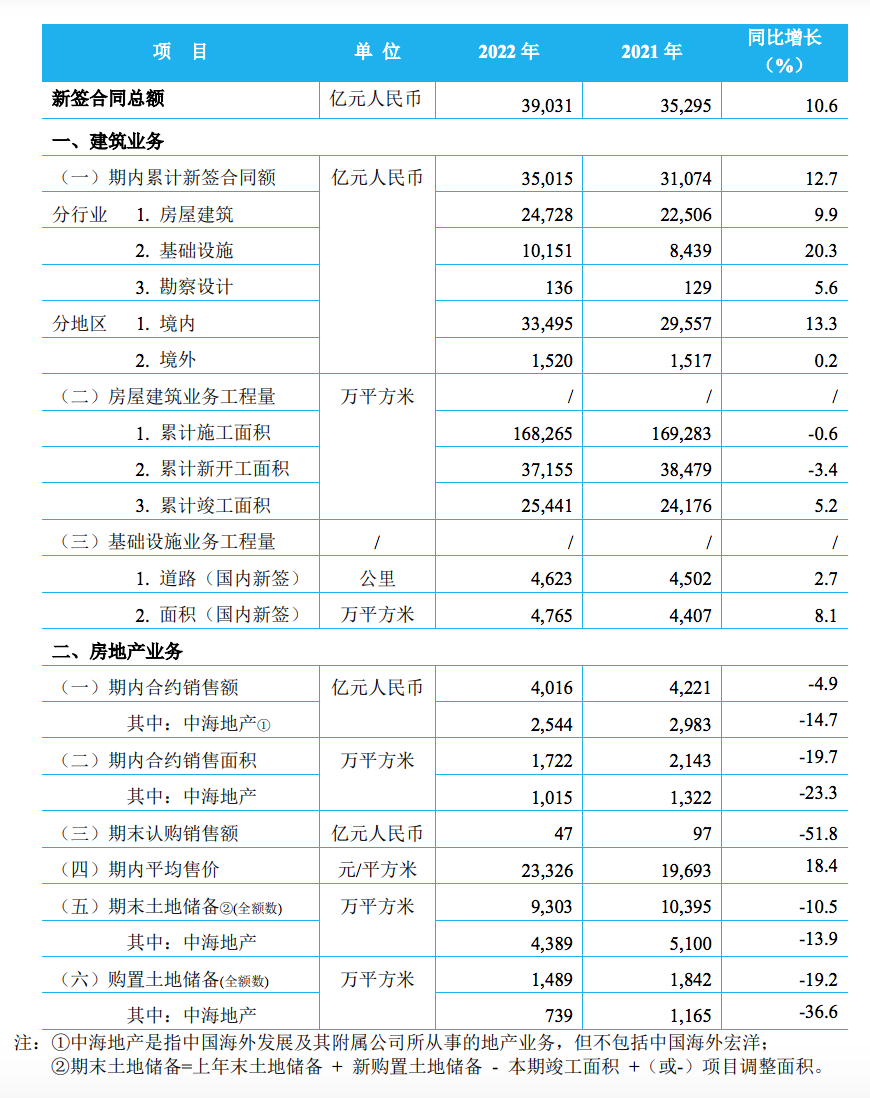 2022年,中国修建完成新签合同总额3.9万亿元,同比增加10.6%,其间,修建事务完成新签合同额3.5万亿元,同比增加12.7%;房地产事务完成合约出售额4016亿元。