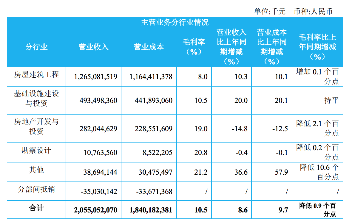 中国修建首要触及的范畴包含房子修建工程、基础设备建造与出资、房地产开发与出资以及勘测规划等。其间,房子修建工程占营收大头,陈述期内,房子修建工程经营收入1.265万亿元,同比增10.3%,毛利率8%;基础设备建造与出资经营收入为4934.98亿元,同比增20%,毛利率10.5%;房地产开发与出资经营收入2820.44亿元,同比下降14.8%,毛利率19%;勘测规划的营收为107.64亿元,同比下降0.4%,毛利率20.8%。