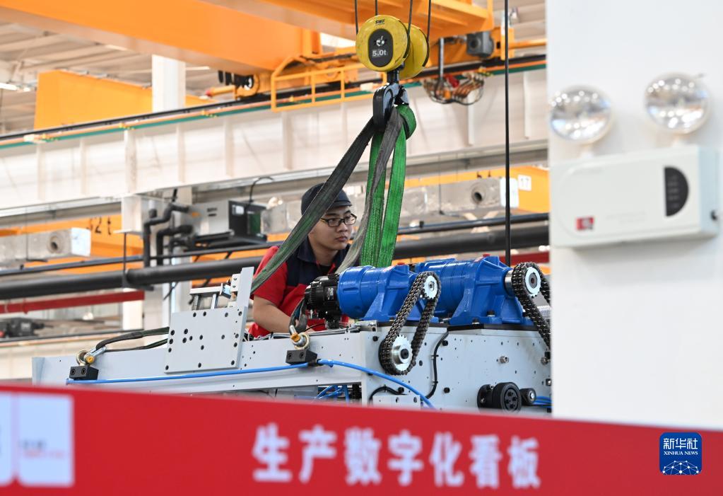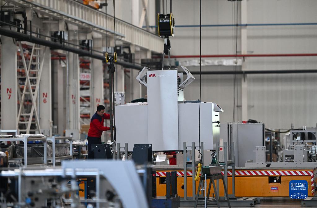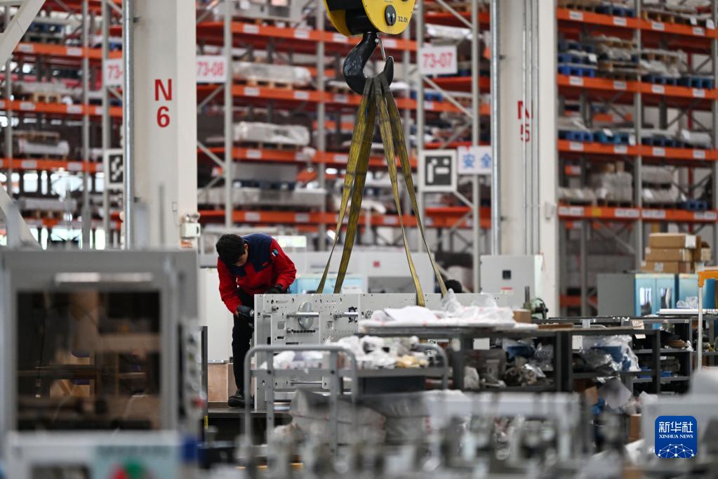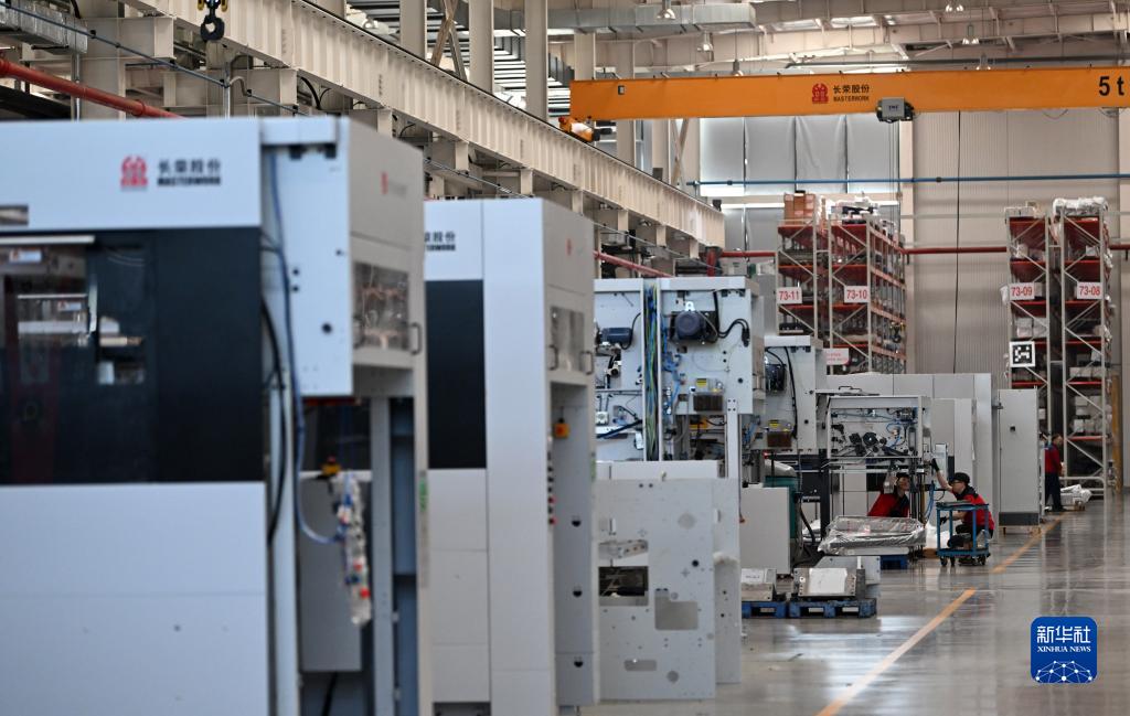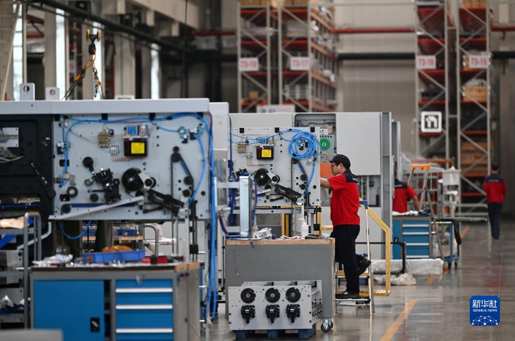 企业职工在天津长荣科技集团股份有限公司出产专区内工作(4月18日摄)。