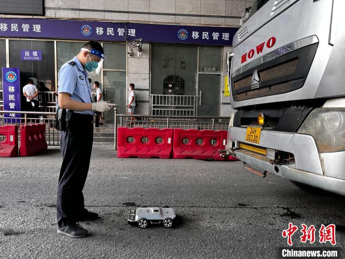 图为民警运用车底查看机器人对货运车辆进行查看。 河口边检站供图