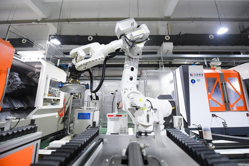 在宁波江丰电子资料股份有限公司分析检测中心,工业机器人在自动化产线加工芯片靶材(3月21日摄)。新华社记者翁忻旸摄