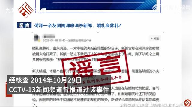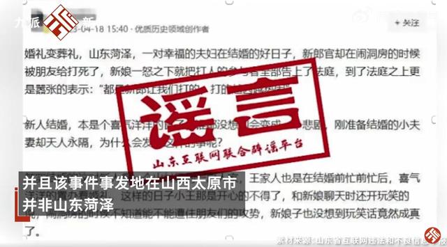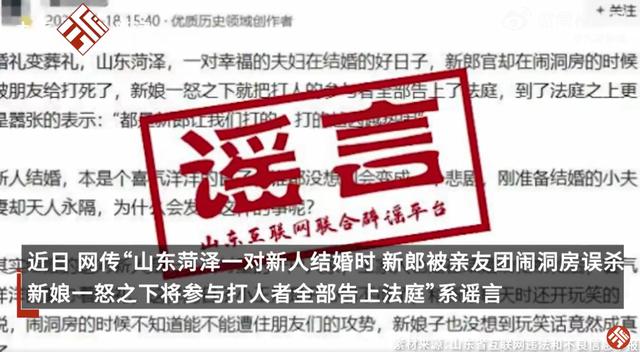 据“菏泽辟谣”消息:近日一自媒体账号“酒馆茶色”发布头条文章,称山东菏泽一对幸福的夫妇在结婚的好日子,新郎官却在闹洞房的时候被朋友给打死了。新娘一怒之下把打人的参与者全部告上了法庭。