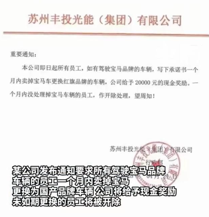 据沸点视频,4月21日,江苏苏州,网传某公司发布一则通知,内容是要求所有驾驶宝马品牌车辆的员工一个月内卖掉宝马,更换为国产品牌车辆,公司将给予2万元现金奖励,一个月内未处理掉宝马车辆的员工将被作开除处理。
