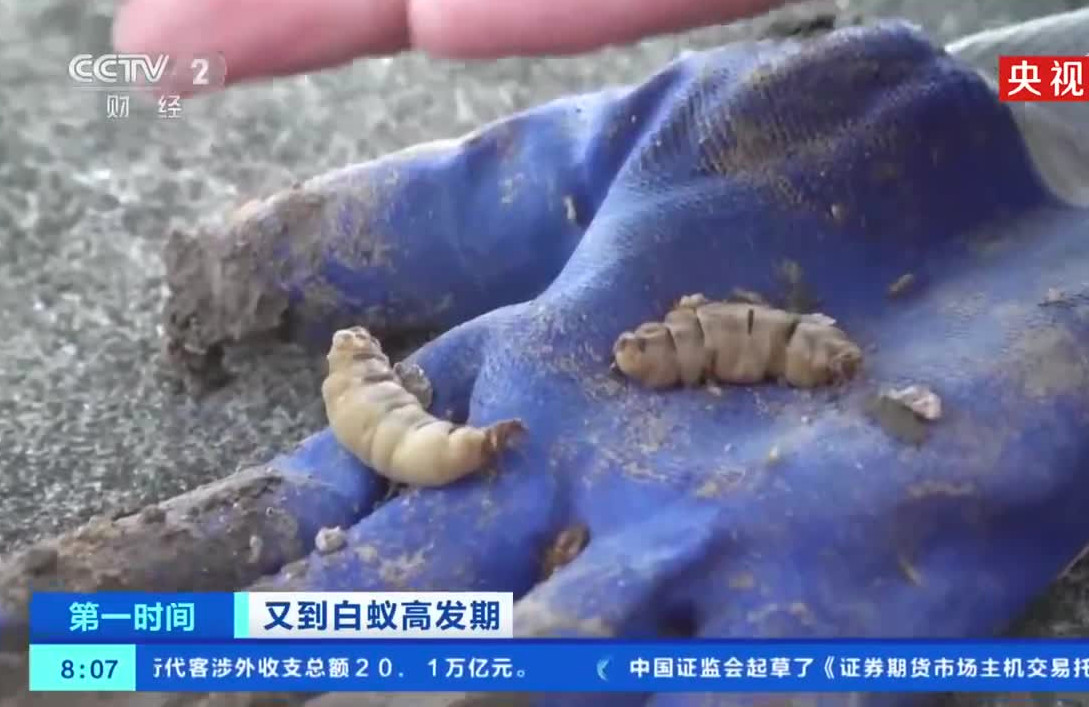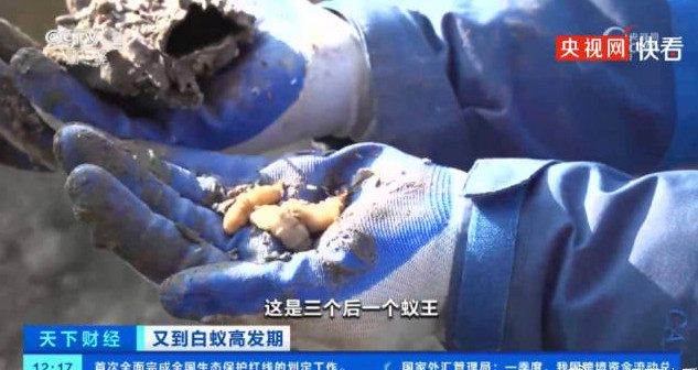 浙江象山县白蚁防治专家 胡成强:里边有3个蚁后、1个蚁王,巢里的白蚁数应该有几十万,乃至过百万。据了解,白蚁一般为一夫一妻制,一夫多妻制较为稀有。从这个蚁王宫廷里掉出的蚁王是黑褐色的;而3条蚁后体形硕大,均有5厘米左右,专家估量,蚁后成长已有十几年。经丈量,这个白蚁主巢间隔岸上最大深度约4米多,巢体直径约为80厘米,挖出的副巢已有15个。