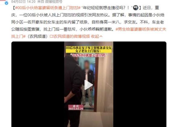 近日,重庆,一位00后小伙被人找上门怒怼的视频引发网友热议。据了解,事情的起因是小伙给同小区一名开豪车的女车主的车内留了纸条,自称身高一米八,求交友。不料,车主老公随后按图索骥,找上门后一番怒斥,小伙乖乖鞠躬道歉。