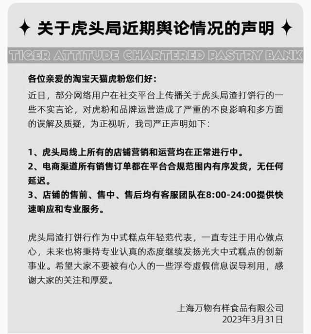 声明称,虎头局线上所有的店铺营销和运营均在正常进行中;电商渠道所有销售订单都在平台合规范围内有序发货,无任何延迟;店铺的售前、售中、售后均有客服团队在8:00-24:00提供快速响应和专业服务。