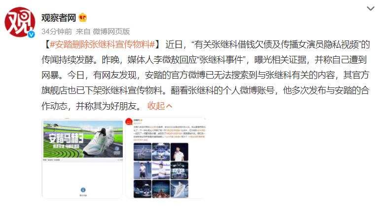 4月3日午间,话题#安踏删除张继科宣传物料#登上微博热搜第一位。安踏客服回应称,“目前已终止和张继科的所有合作”。