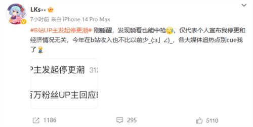 而刚拿到百大UP主不久,并同样在近日宣布停更的-LKS-也在微博表示,“仅代表个人宣布我停更和经济情况无关,今年在b站收入也不比以前少”。