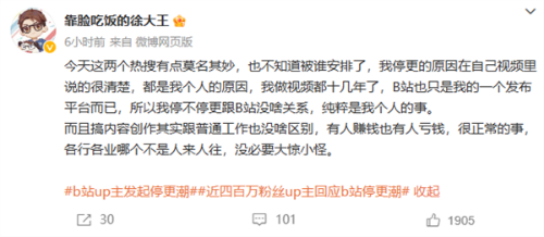 在此次停更的UP主中,游戏区博主UP主靠脸吃饭的徐大王发布微博表示,自己停更属于个人原因,B站也只是自己的一个发布平台而已,停不停更与B站无关。