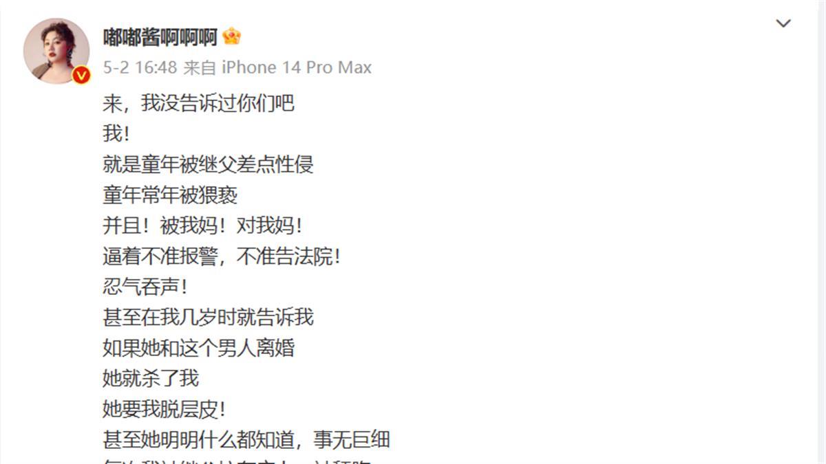 5月2日,拥有百万粉丝的美妆博主“嘟嘟酱啊啊啊”公开发布消息称,“来,我没告诉过你们吧。我,就是童年差点被继父性侵,童年常年被猥亵。还被我妈妈逼着不准报警,不准告法院!”