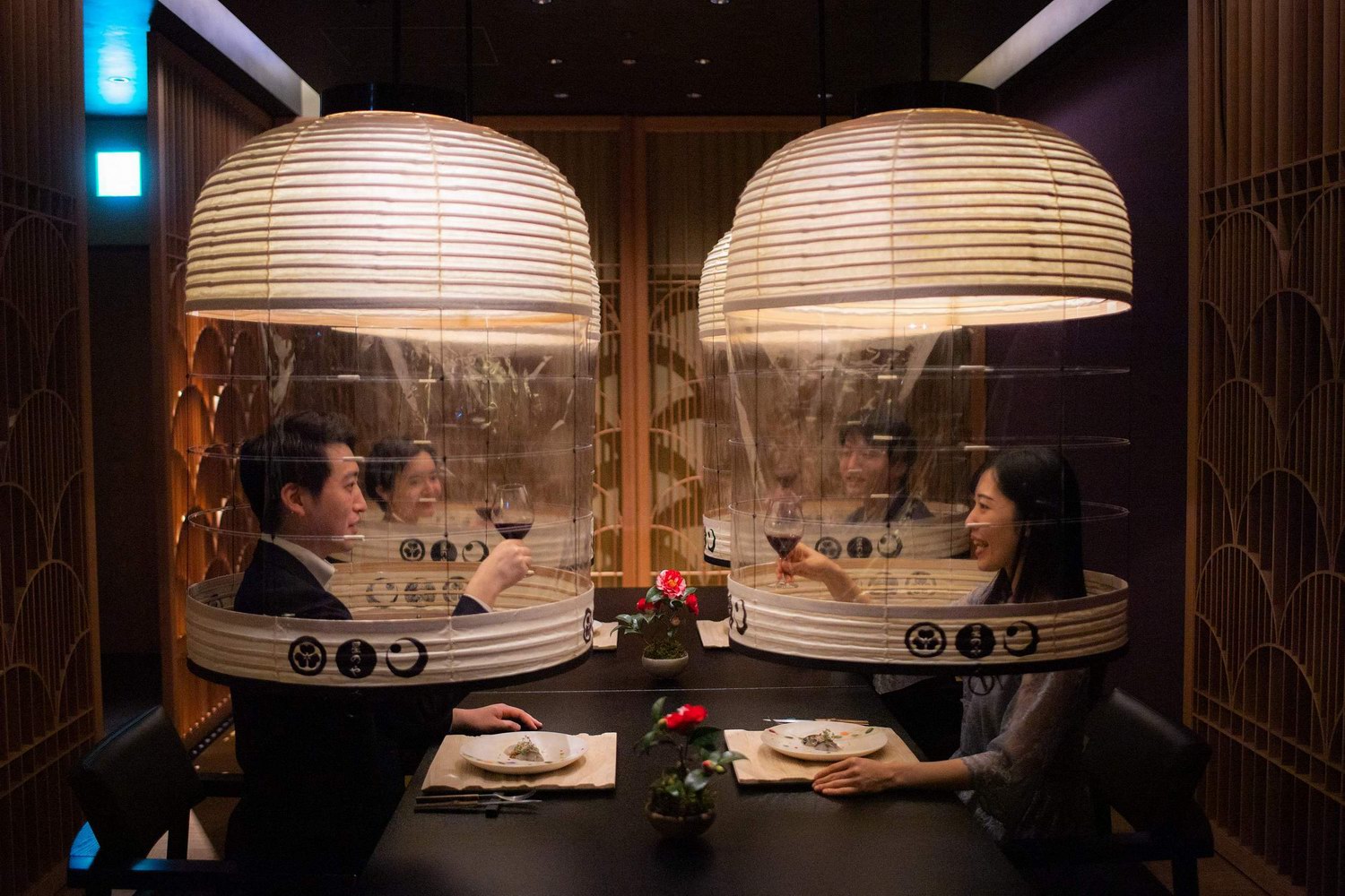 当地时间2022年2月28日,日本东京,酒店的工作人员在媒体活动上展示了“灯笼用餐体验”,在新冠肺炎疫情期间,该商店制作的灯笼被用来覆盖食客,让他们不用戴口罩用餐(资料图)。