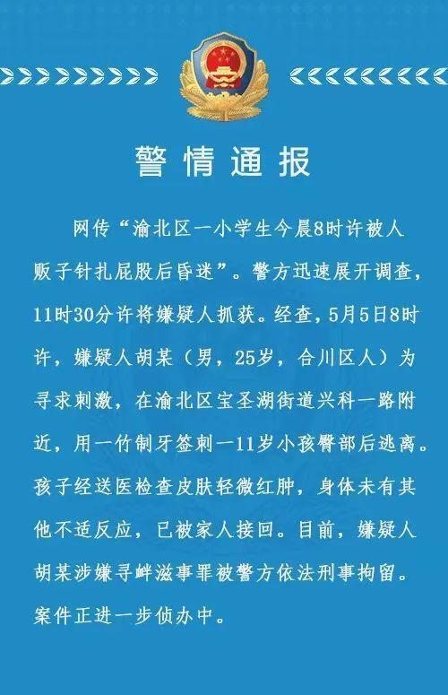 网传“渝北区一小学生今晨8时许被人贩子针扎屁股后昏迷”。警方迅速展开调查,11时30分许将嫌疑人抓获。经查,5月5日8时许,嫌疑人胡某(男,25岁,合川区人)为寻求刺激,在渝北区宝圣湖街道兴科一路附近,用一竹制牙签刺一11岁小孩臀部后逃离。孩子经送医检查皮肤轻微红肿,身体未有其他不适反应,已被家人接回。目前,嫌疑人胡某涉嫌寻衅滋事罪被警方依法刑事拘留。案件正在进一步侦办中。