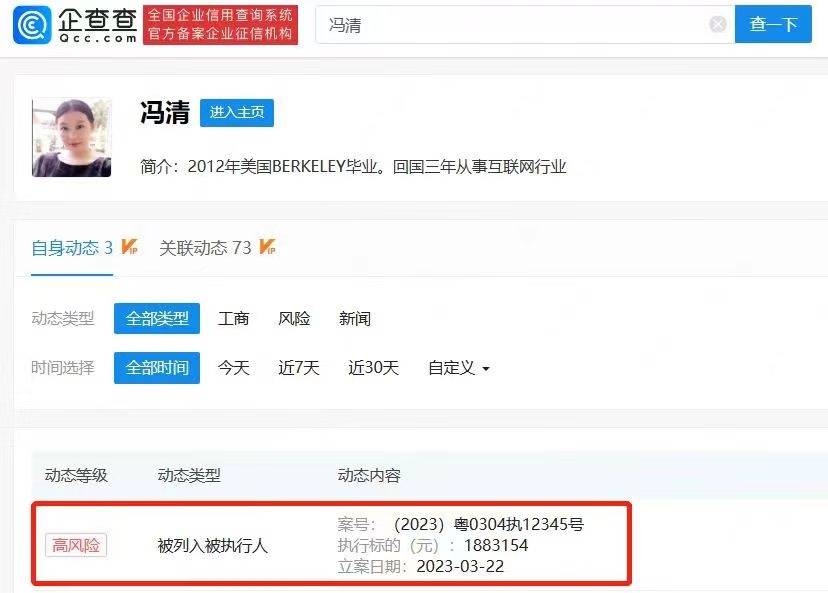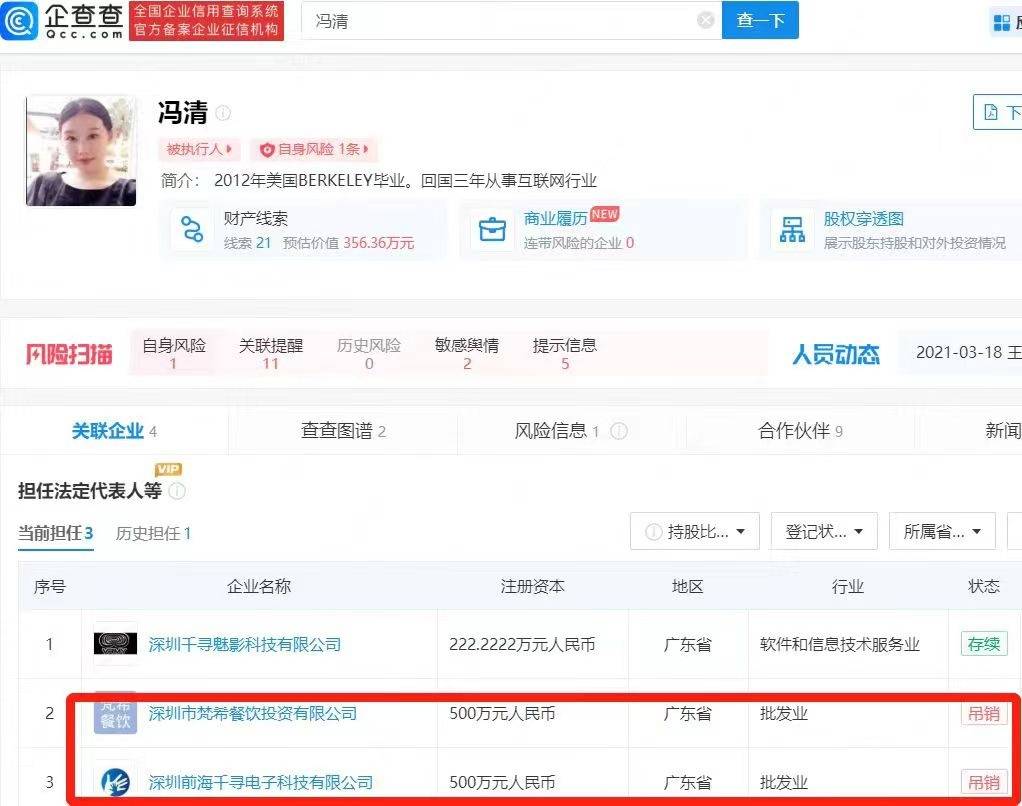近日,“王宝强女友冯清成被执行人”引发关注。企查查APP显示,3月22日,深圳千寻魅影科技有限公司法人代表冯清被法院执行188万。