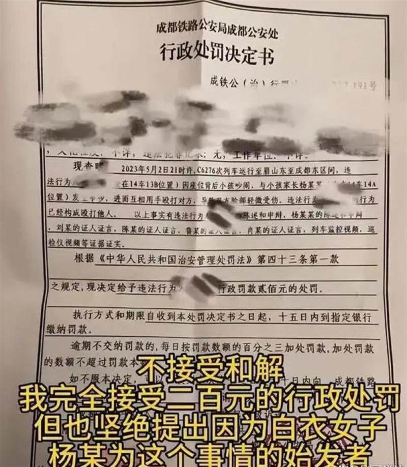 近日,成都铁路公安局针对一起案件的“互殴”认定引发网络关注。5月2日,一女子发布视频称,当天其乘坐C6276次列车,途中因制止熊孩子撞椅背遭到对方家长掌掴,并进行反击。她最终被警方罚款200元,对方则被罚500元。5月7日,该女子再次发文称,目前她正提起行政复议,坚持不和解。