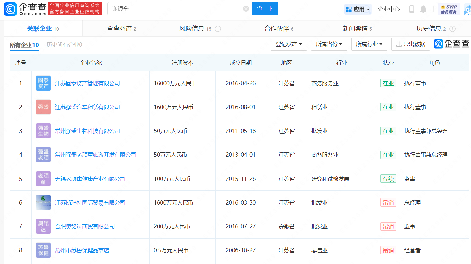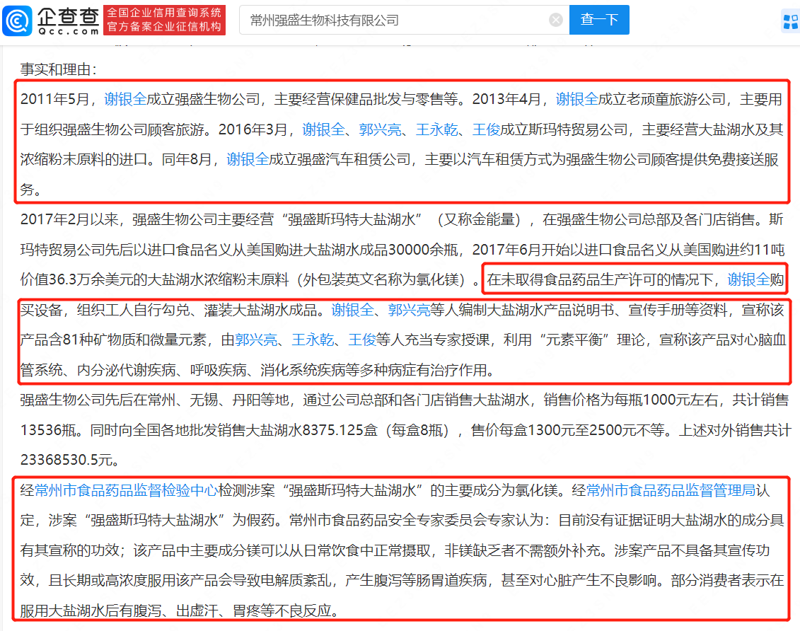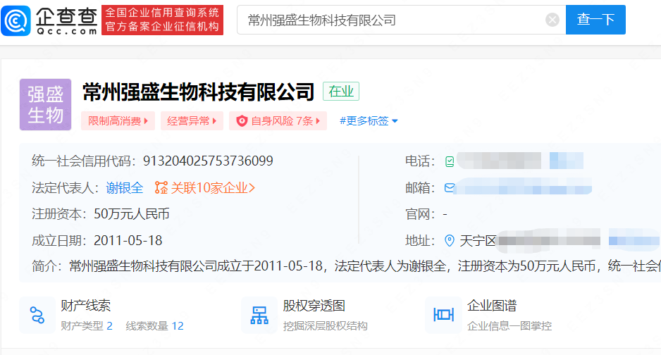 企查查APP显示,常州强盛生物科技有限公司成立于2011年5月,注册资本50万元,经营范围含生物产品、保健食品的的技术开发等。法定代表人谢银全名下共关联10家公司,5家为存续状态,其中包括常州强盛老顽童旅游开发有限公司,江苏强盛汽车租赁有限公司等。