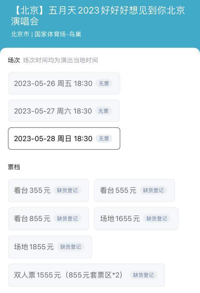 平台页面显示,5月26、27、28三天所有档位的票,均已显示缺货登记。