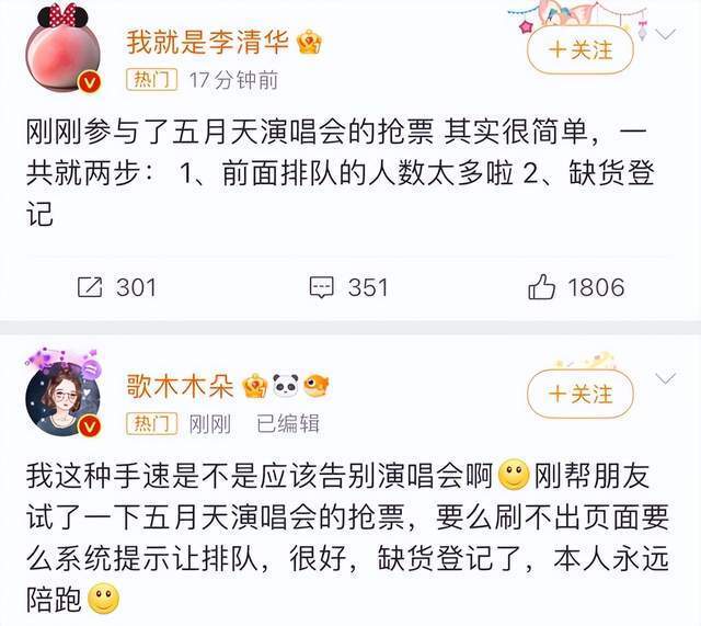 网友“@我就是李清华”说,刚刚参与了五月天演唱会的抢票,其实很简单,一共就两步:1、前面排队的人数太多啦;2、缺货登记。