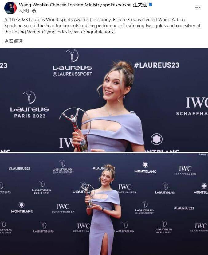 发言人汪文斌转发谷爱凌拿到劳伦斯最佳极限运动员奖动态,并且配文:“祝贺!谷爱凌凭借在北京冬奥会上2金1银的成绩,在2023年劳伦斯体育奖颁奖典礼上,拿到了最佳极限运动员奖。”