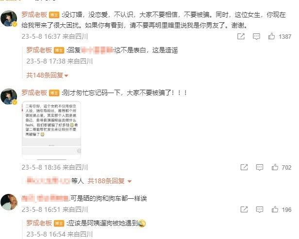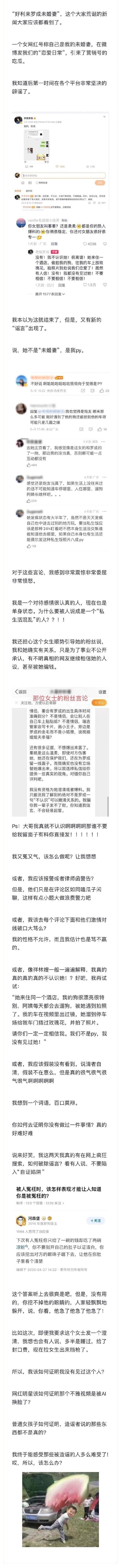 同时还梳理了事件经过,称该女网红号称自己的未婚妻,在社交平台发布“恋爱日常”,自己第一时间在各个平台辟谣。罗成还称对方偷拍自己的狗,往自己的车上放玫瑰花,拍照片到处说和自己恋爱,但自己根本没见过她。