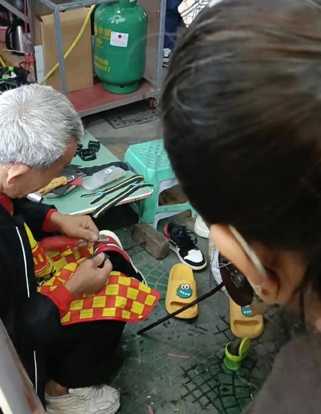 女子刚开始就想着让大爷把这个鞋子给稍微处理一下,顺便把鞋子的这个边角给修一下就行,不知道大爷是没有听懂女子说的话,还是对于这个鞋子有他自己的看法,反正就是大爷也是看起来非常专业的样子。