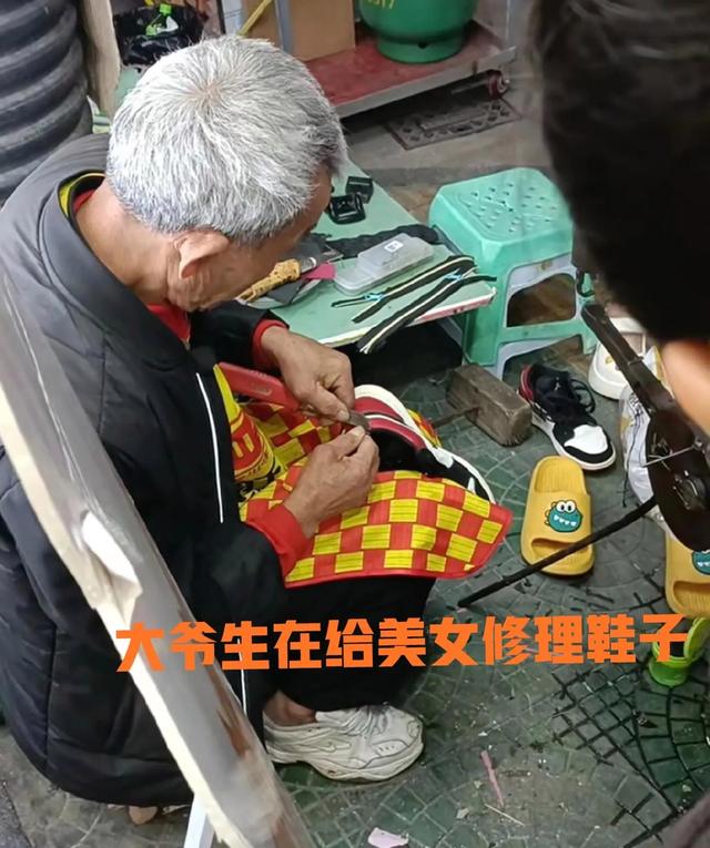 之后大爷像是开了挂一样的把美女的鞋子一番摆弄,之后女子好像看出来大爷没有按照自己的想法去修理自己的这个鞋子,大爷好像是看出来这个鞋子还有一些其他的问题,然后想要顺便把这个鞋子的其他问题也给修一下。