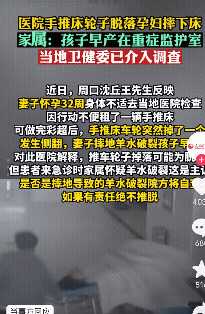 医院手推床轮子脱落孕妇摔下床,已介入调查