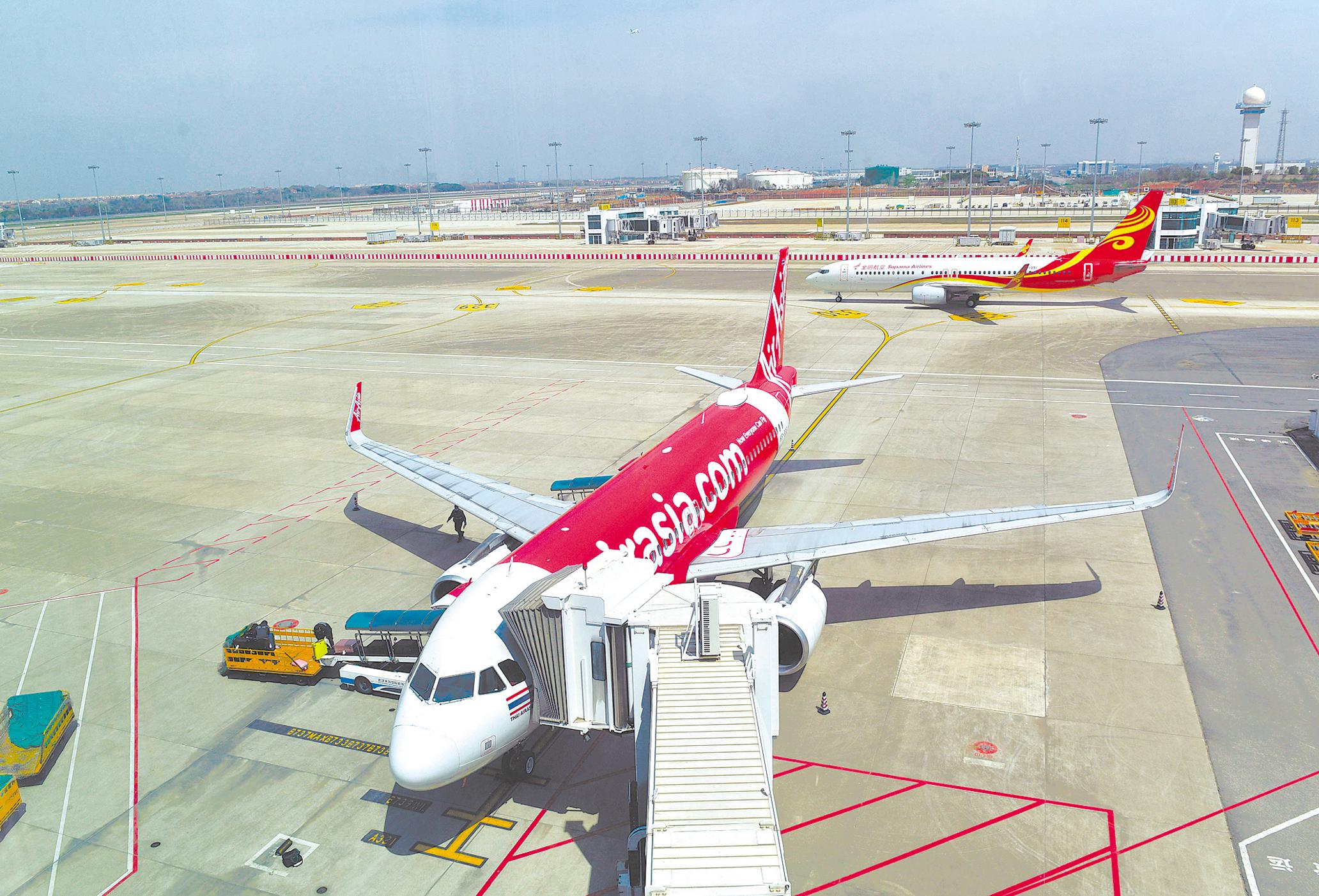 3月26日,武汉—曼谷(廊曼)航线正式康复,亚航飞机停靠在廊桥 记者倪娜 通讯员陈晓东摄