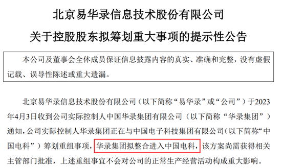 4月3日晚间,易华录发布公告称,公司收到实践操控人中国华录集团有限公司(简称“华录集团”)告诉,华录集团正在与中国电子科技集团有限公司(简称“中国电科”)谋划重组事项,华录集团拟整合进入中国电科。易华录表明,该计划需要取得相关主管部门同意,上述重组事宜不会对公司的正常出产经营活动构成严重影响。公司将依照法律法规的要求及时发表开展状况。