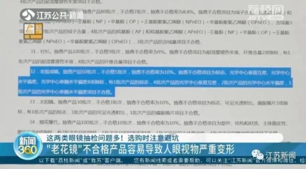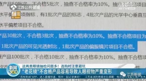 老视成镜是俗称的“老花镜”,依据江苏省商场监管局发布,检查的50批次老视成镜产品中,5批次不合格,检查不合格率为10%。