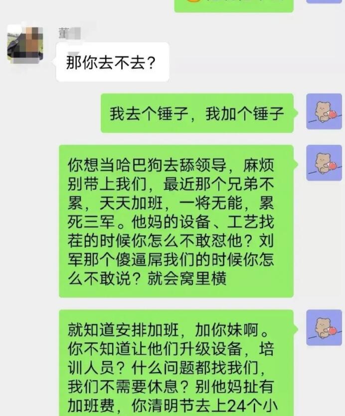 陈志龙:我去个锤子,我加个锤子。你想当哈巴狗去舔领导,麻烦别带上我们,最近哪个兄弟不累,天天加班,一将无能.累死三军。TM设备、工艺找茬的时候,你怎么不敢怼他?……就会窝里横;就知道安排加班,加你妹啊。