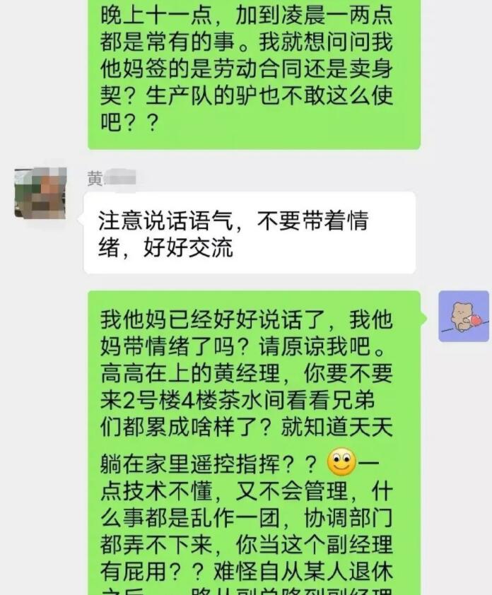 陈志龙:我TM已经好好说话了,我TM带情绪了吗?请原谅我吧,高高在上的黄经理你要不要来2号楼4楼茶水间,看看兄弟们都累成啥样了?就知道天天躺在家里遥控指挥??一点技术不懂,又不会管理,什么事都是乱作一团,协调部门都弄不下来,你当这个副经理有屁用??难怪自从某人退休之后,一路从副总降到副经理哦.你问问手底下这些兄弟,有谁服你?