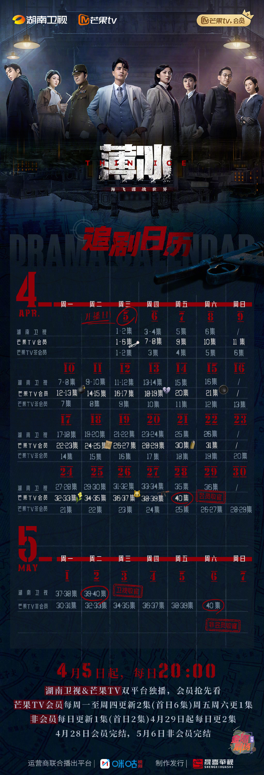 1、薄冰更新时间什么时候播出:4月5日起,每日20:00湖南卫视&芒果TV双平台独播,会员抢先看,芒果TV会员每周一至周四更新2集(首日6集)周五周六更1集;非会员每日更新1集(首日2集)4月29日起每日更2集。4月28日会员完结,5月6日非会员完结。一共40集。