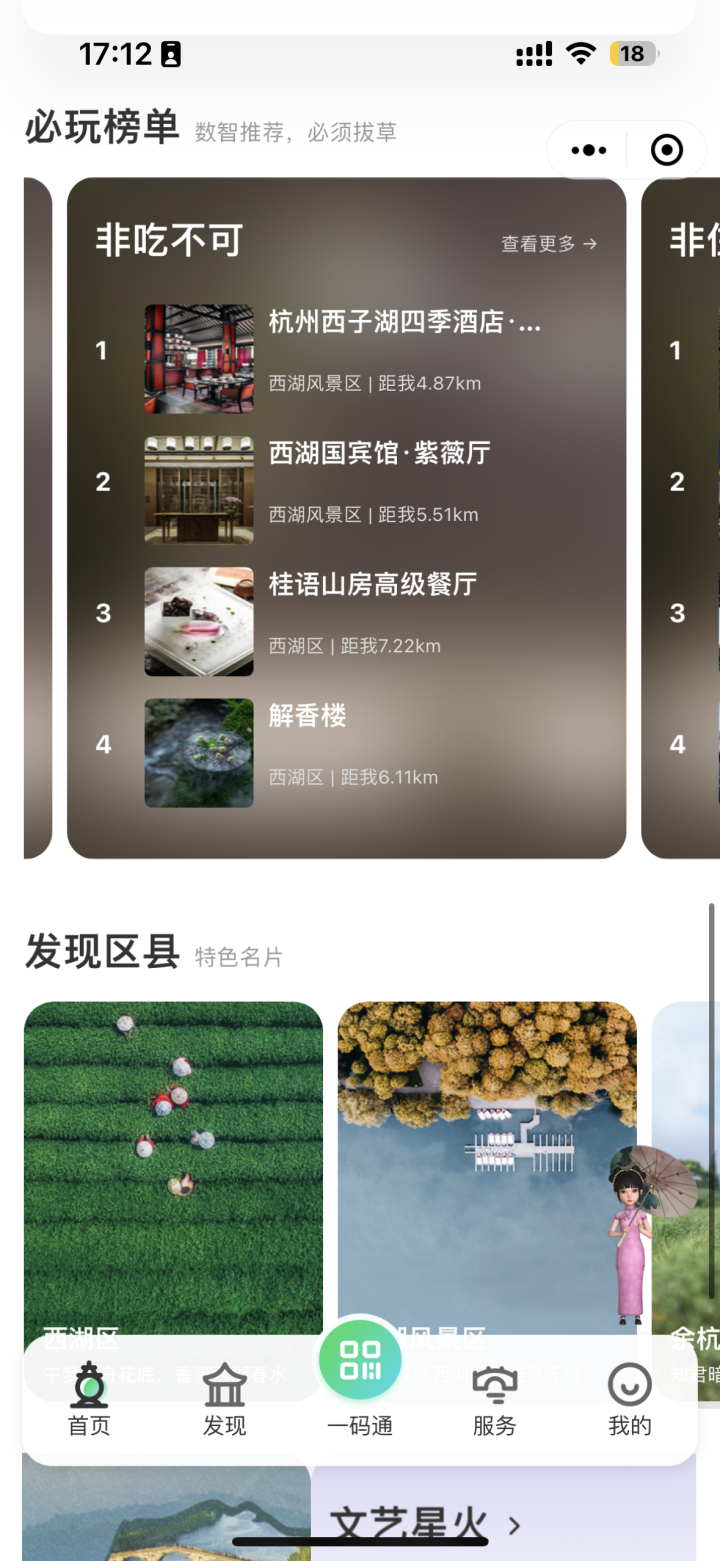 不过酒店3年来在餐饮赛道上的发力也取得了作用。在最新发布的2023美团黑珍珠餐厅指南中,多家高星酒店的餐厅位列其间。在杭州市文明广电旅行局的官方才智游小程序“发现杭州”上,主页的“非吃不可”榜单前3名便是西湖国宾馆、浙江饭馆和杭州香格里拉饭馆。榜单数据来源为归纳各大渠道数据分析得出的,可见酒店餐饮人气有多高。