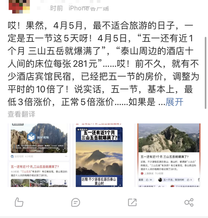 “这次清明出游,咱们发现酒店价格飞涨,有的景点周边三星级的商旅酒店都飙到了500元/间。”今天(4月5日),翻开微博、抖音等交际渠道,不少网友吐槽称同比上一年,清明出游本钱贵了不少,不光是房价涨了,酒店餐饮也贵了。
