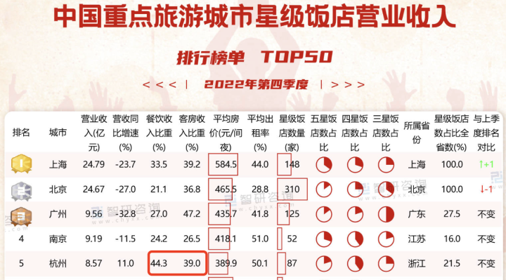 潮新闻记者还查找到了一份《2022年第四季度中国要点旅行城市星级饭馆运营收入排行榜》(下简称“排行榜”)。《排行榜》显现杭州星级酒店的餐饮收入占比为44.3%,超越客房收入的39%。