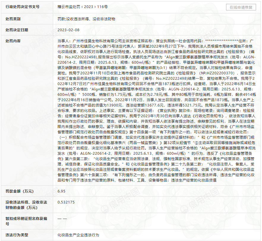 据信誉中国发布的处分决议显现,佳昊生物出产不合格的“Algn爱兰歌娜氨基酸植萃净彻洗发水(批号:ALGN-220614-2、限用日期:2025.6.13、规范:600ml/瓶)”合计5000瓶,本钱价格为1.75元/瓶,出售价为2.78元/瓶,其间80瓶用于自检耗费,6瓶为留样,剩下4914瓶于2022年6月16日出售给**公司。2022年11月2日,当事人宣布召回陈述,共召回不合格产品1873瓶。白云区商场监督管理局于2022年12月7日对该批不合格产品进行扣押。并查明,当事人佳昊生物出产上述被抽检不合格产品的货值为13900元,违法经营额13677.6元,违法所得5321.75元。